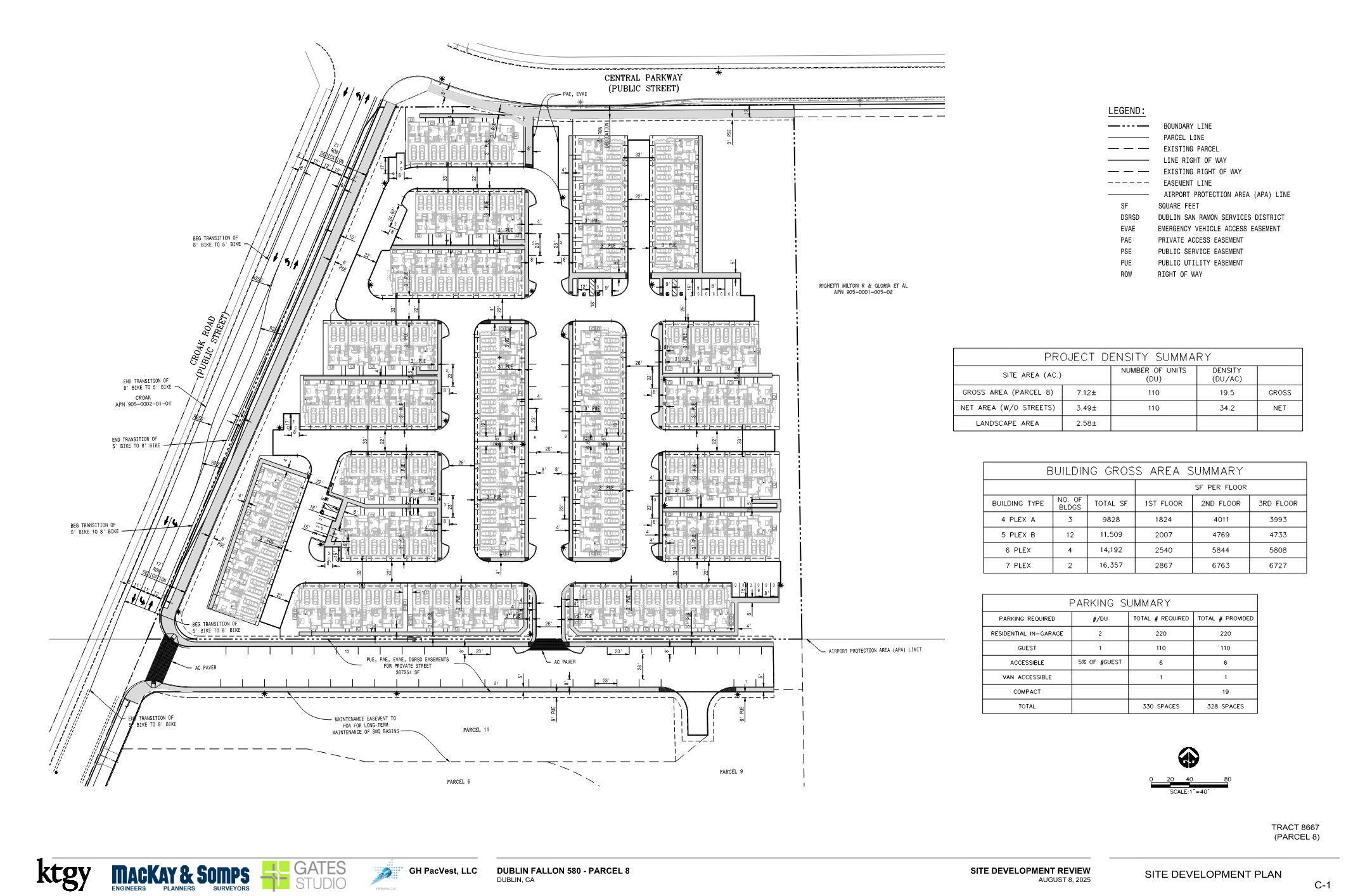 Development of 110 three-story townhome units with private two-car garages and related site improvements (Tract 8667 Parcel 8). The application includes a Site Development Review Permit.