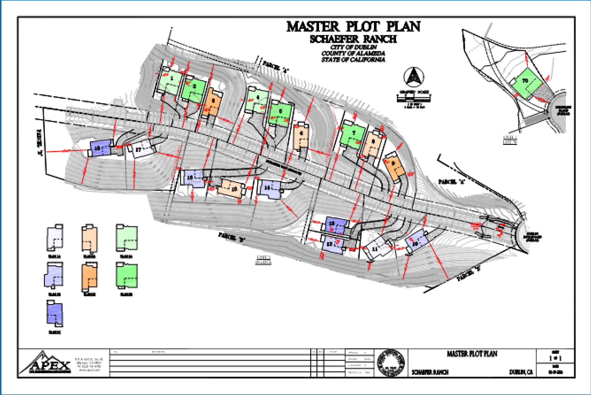 Schaefer Ranch Unit 3 & Schaefer Unit 1, Lot 70 is an application for a Conditional Use Permit, Site Development Review Permit, and Lot Line Adjustment for a residential development which includes 19 new single-family residential houses. The project is located on a 7-acre site on the western side of Dublin Boulevard, with a 21,017 square-foot parcel detached from the main parcels, located on the western edge of Ridgeline Place. The project consists of 19 total parcels, with 18 connected parcels on the main site, and one parcel detached from the rest. This application will review changes to Planned Development Ordinance No. 06-16, adopted by the Dublin City Council on June 21, 2016, to include modifications to the previously approved architectural standards.